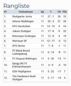 Spannung pur am letzten Spieltag. Als Verfolger hatten wir 60 Punkte aufzuholen, um noch den Gesamtsieg zu holen. Das konnten wir aus der eigenen Kraft praktisch nicht schaffen und waren auf Patzer vom Gejagten, Inferno aus Waiblingen, angewiesen.
